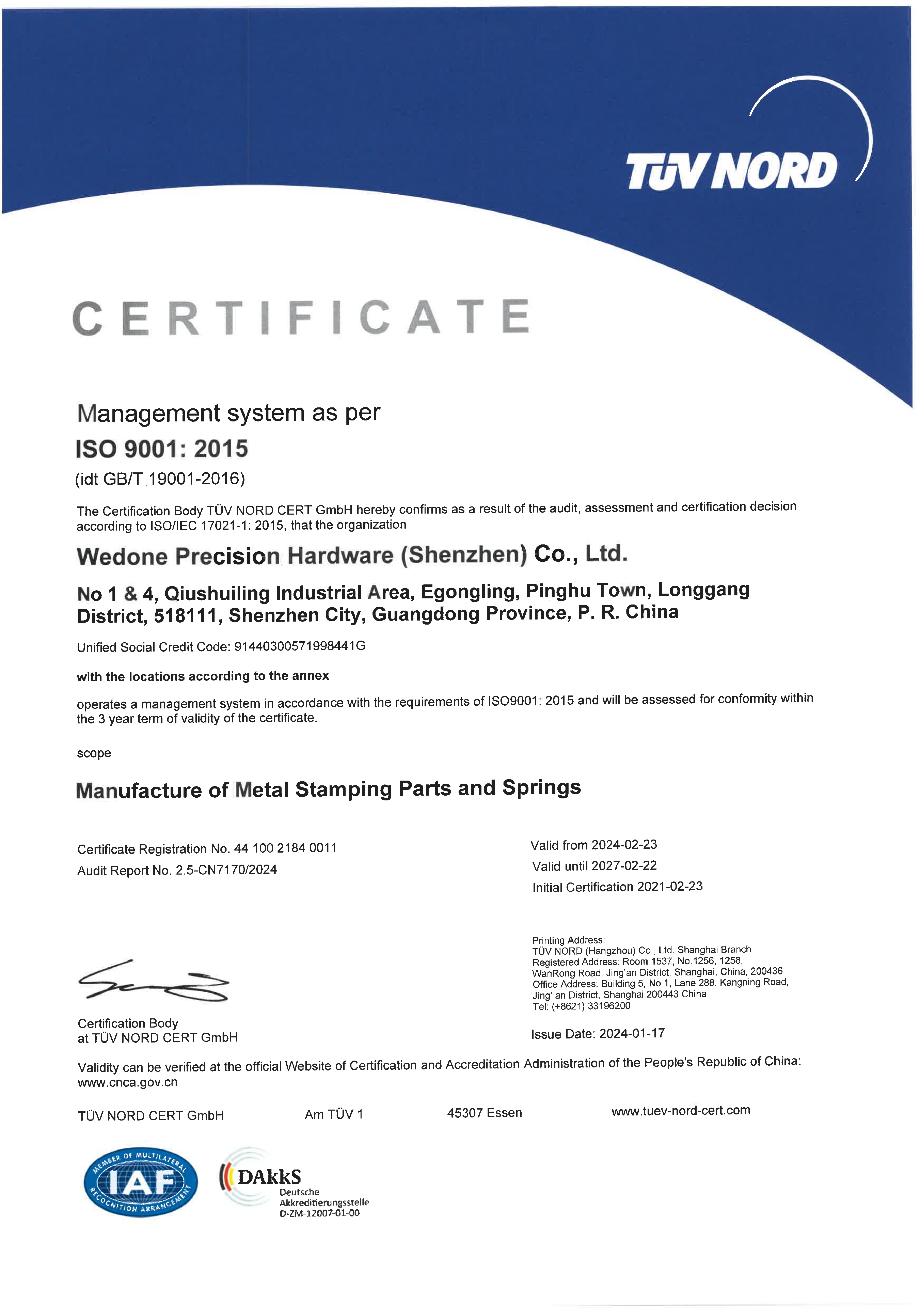 ISO 9001: 2015 中文版证书(伟登重庆)
