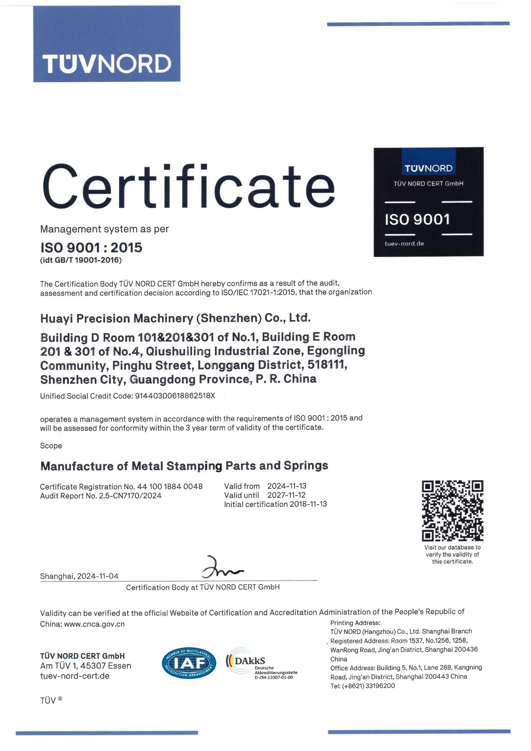 ISO 9001: 2015 英文版证书(华一)