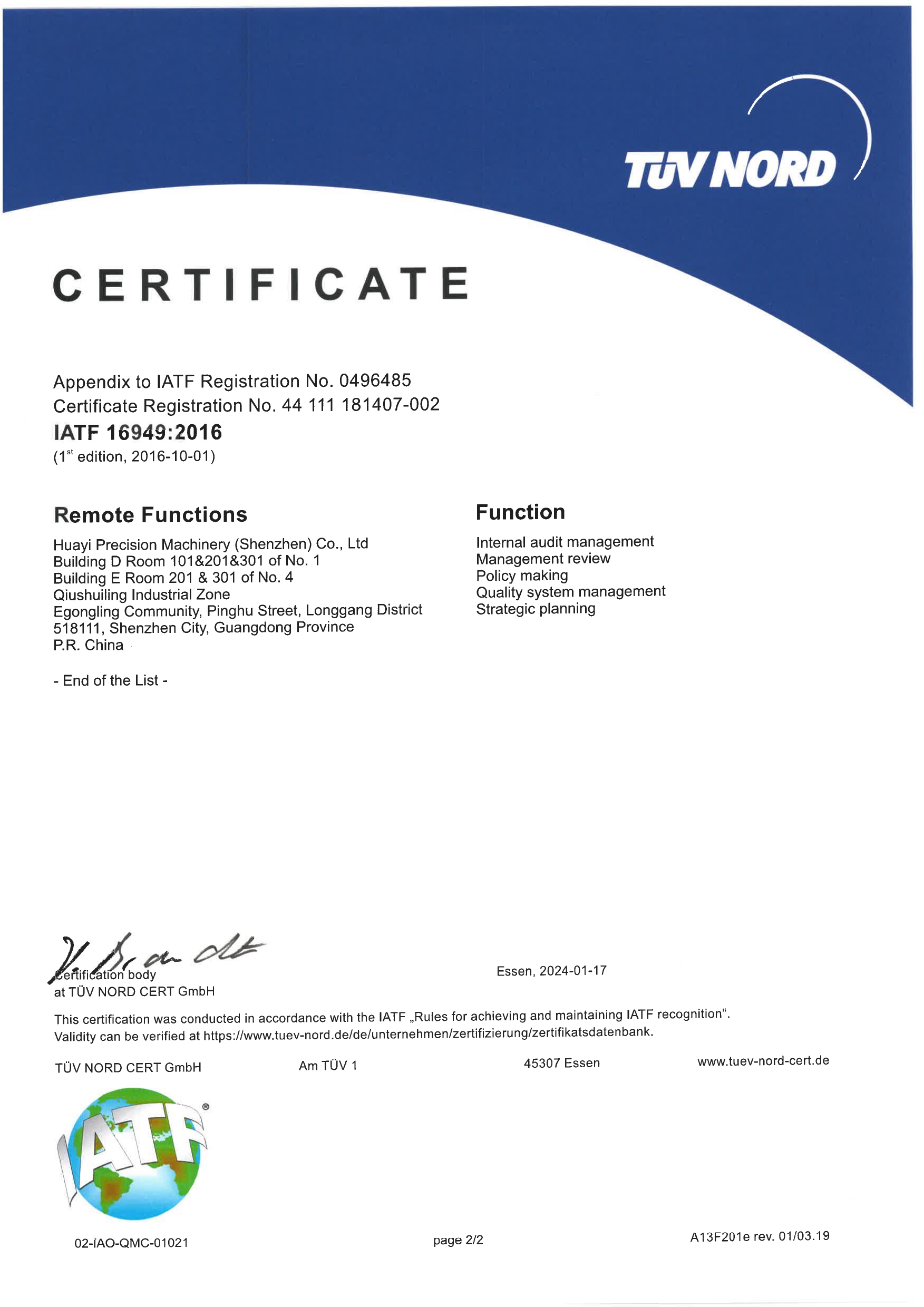IATF 16949: 2016 英文版证书(华一)